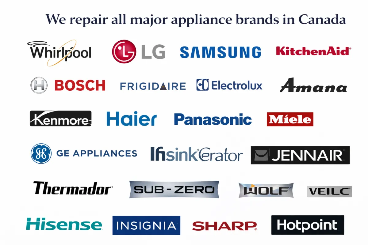 We repair and install all household appliances from every major brand available in Canada, including Whirlpool, GE, LG, Samsung, Bosch, KitchenAid, Frigidaire, Maytag, Electrolux, Miele, Amana, Inglis, Kenmore, Fisher & Paykel, Panasonic, Blomberg, Danby, Hisense, Haier, and more. Our experienced technicians diagnose and fix all common appliance problems, delivering fast, reliable service you can trust.